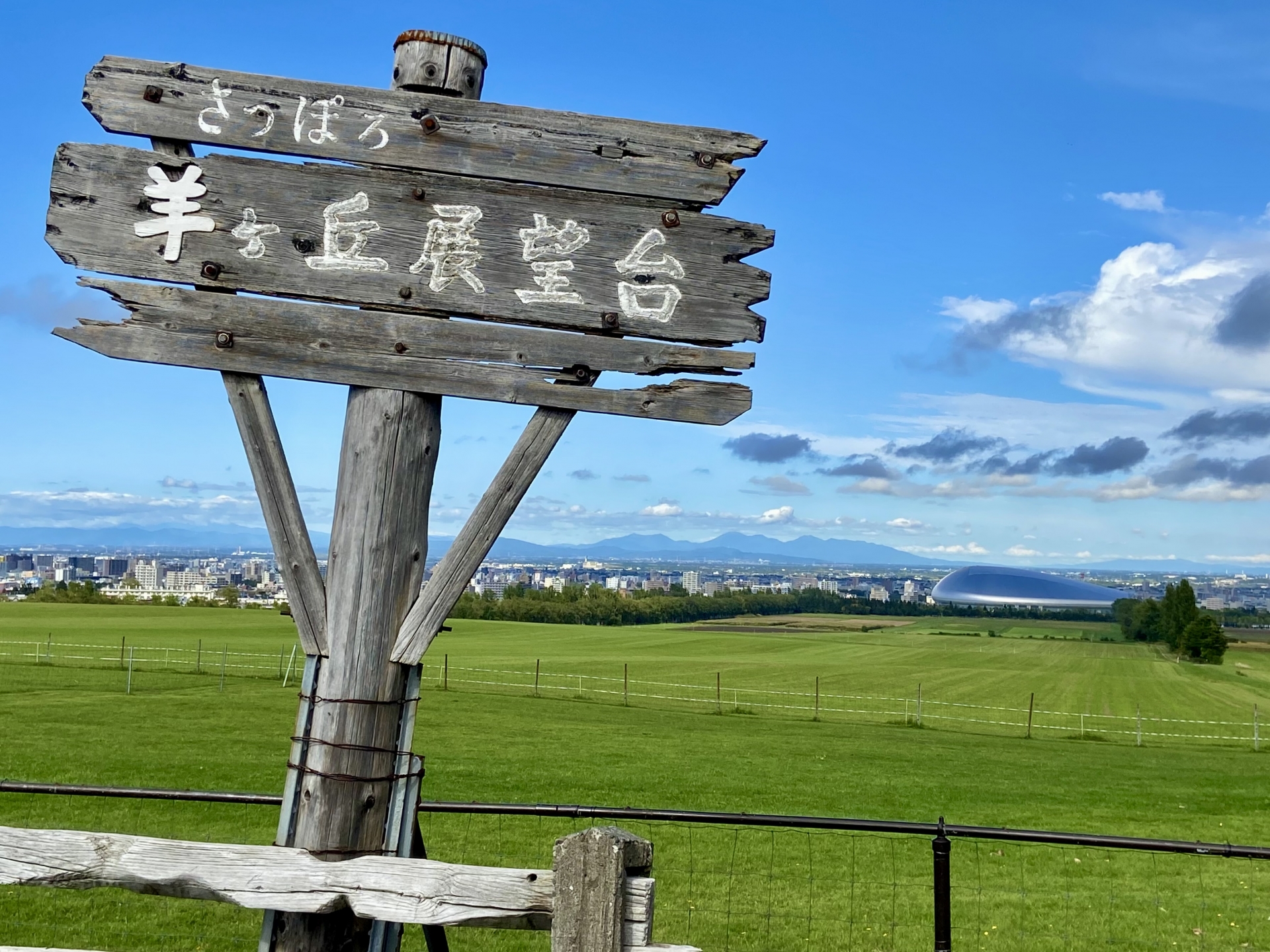 ここは札幌の市街地を見下ろす丘です。牧草地の向こうには札幌ドームや近代的なビル群が広がっています。 しかし、この「都市と牧歌的風景のコラボ」こそが札幌のリアルな魅力でもあります。