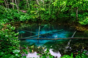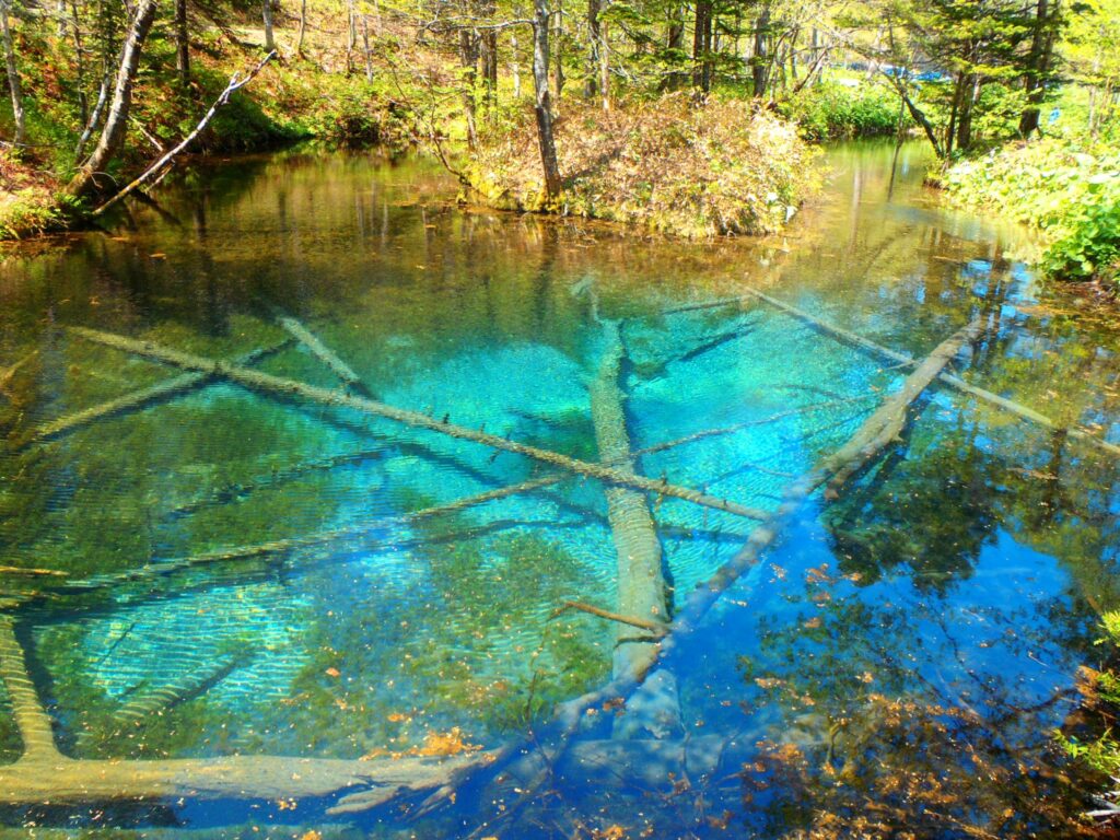 神の子池が青く輝く理由は、強酸性の摩周湖の伏流水に、強い太陽光が差し込むことで青い光が散乱するためです。つまり、「強力な直射日光」こそが、絶景のスイッチなのです。