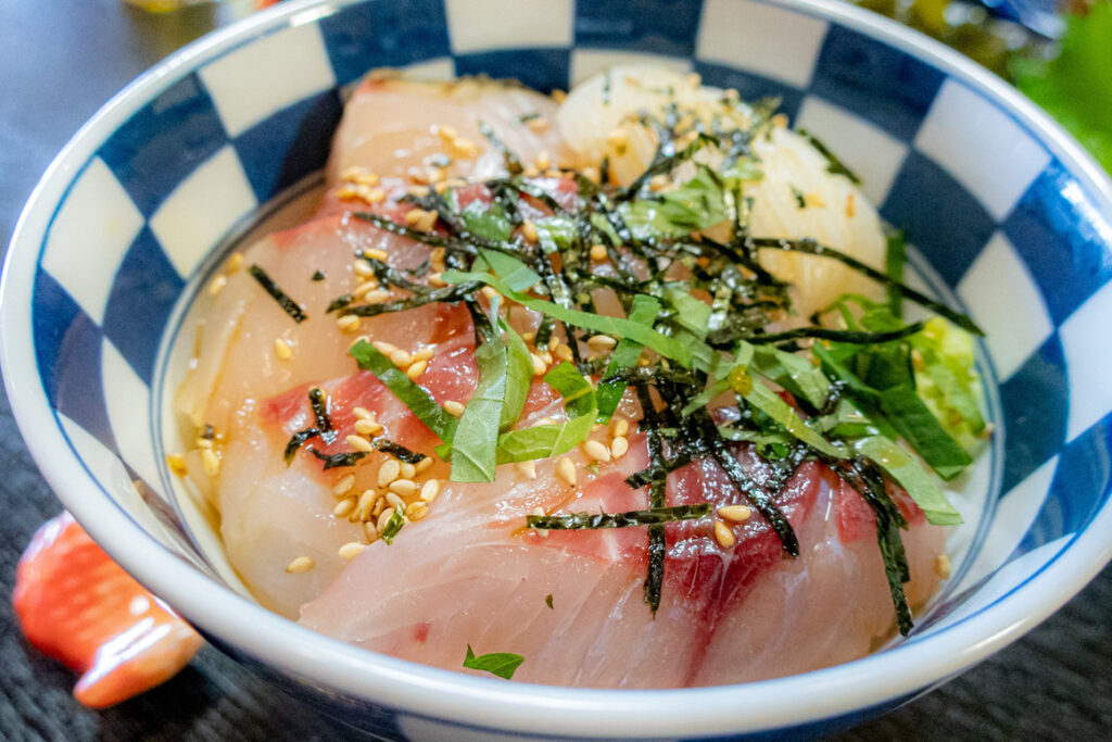 海鮮ランチに景色まで求めるなら、和歌浦方面の候補として外しにくい店です。和歌浦漁港近くの建物を生かした空間で、地元の魚を使った丼が評判。和歌山県公式観光サイトでは、海老やしらすなどをのせた丼が紹介されていて、食事だけでなく海辺の雰囲気も楽しみたい日に向いています。駅近ではないぶん車移動向きですが、雨でも店内でゆっくりしやすく、漁港駐車場利用の情報も掲載されています。