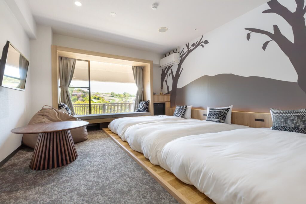 ファミリー向け客室は、ロフトベッド付きのデラックスファミリーツイン、4人で泊まりやすいファミリーコーナーカルテットルーム、畳スペースのあるジャパニーズスパスイートなど選択肢があります。自家源泉の温泉や貸切風呂もあり、ホテル滞在そのものを楽しみやすい一軒です。