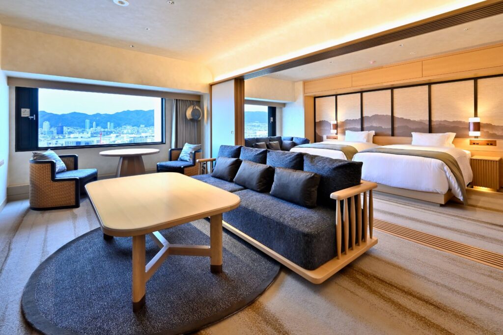 淡路島で、にぎやかすぎないリゾートホテルを探している家族に向いています。神戸市内から車で約30分、大阪市内から約60分で、バスなら「淡路夢舞台前」下車すぐ。和室は64〜78㎡で、洋室中心のホテルのなかでは子連れで選びやすい部屋が見つけやすい宿です。