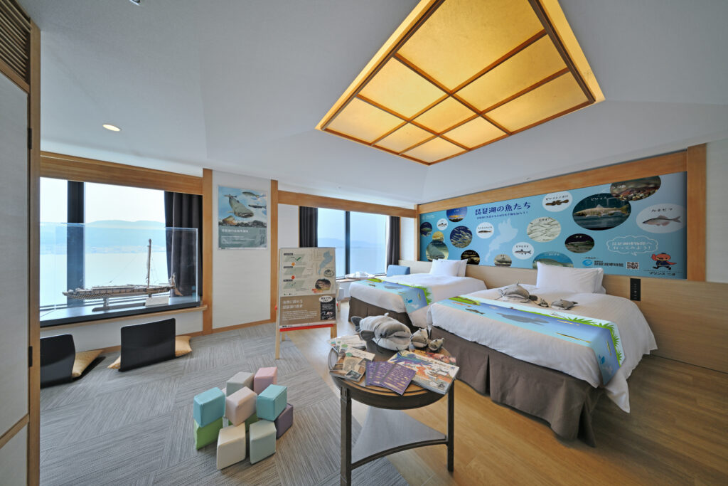 ラウンジやロビーからも琵琶湖を望めるつくりで、にぎやかな観光地のホテルというより、景色と食事そのものを楽しむ滞在に寄せやすい宿です。料理は「徳山鮓」徳山浩明氏監修のコースが打ち出されており、食を含めて宿を選びたい人に合います。